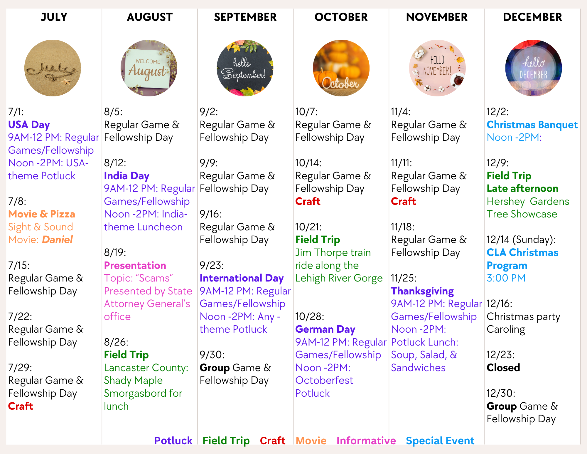 Be sure to check back for an updated calendar of events. You may need to sign up for some activities!